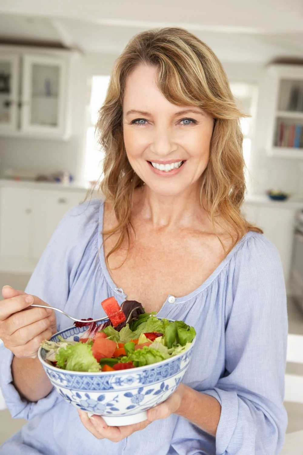 Healthy woman eating a large salad in a pretty blue bowl