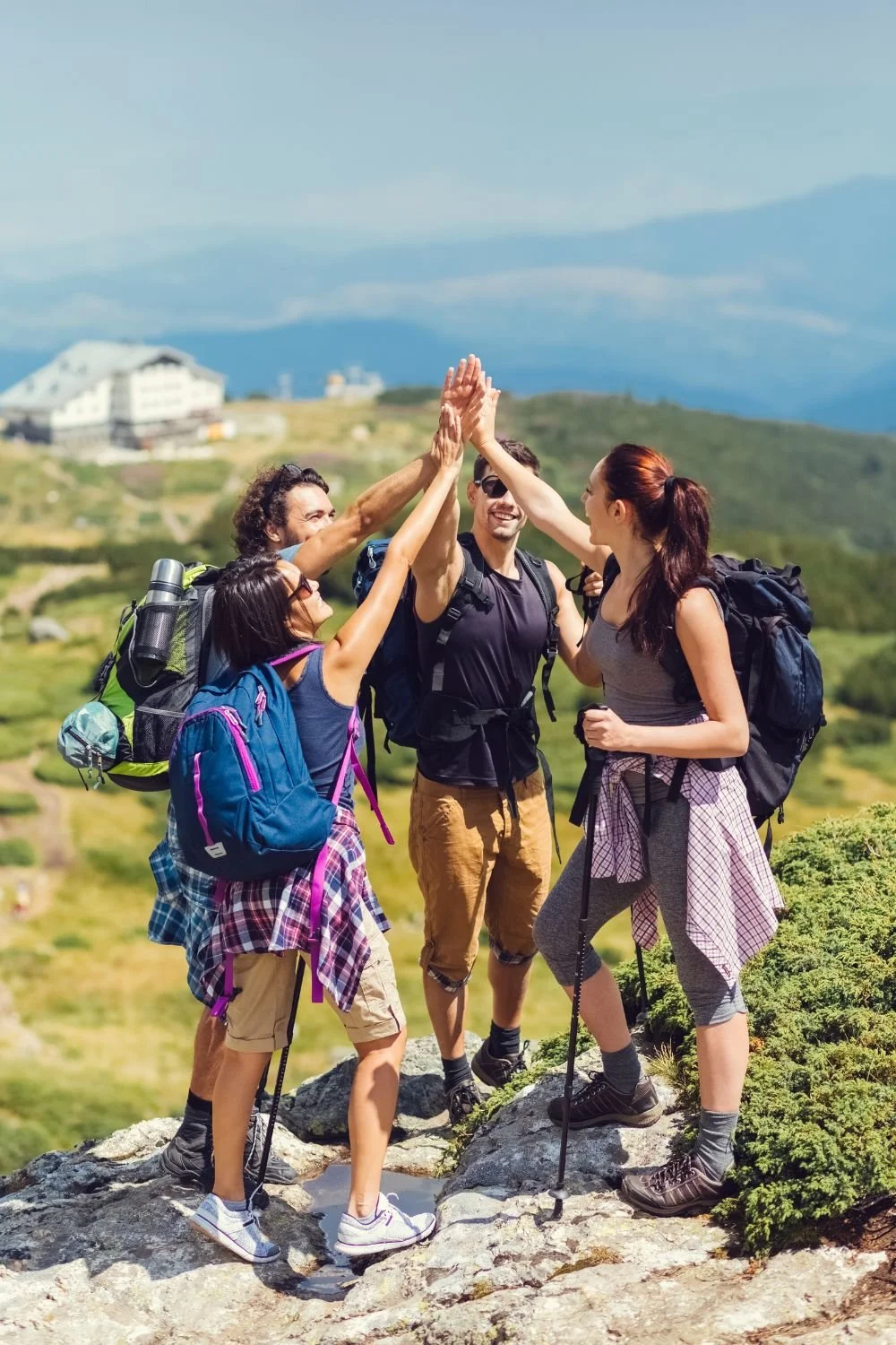 Four people hiking and high-fiving, representing an active, healthy lifestyle supported by a plant-based diet.